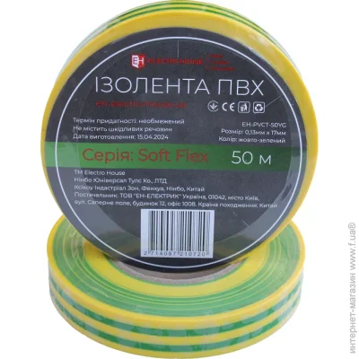 - Изолента Electrohouse Изоляционная лента Soft Flex желто-зеленая 50м (EH-PVCT-50YG)