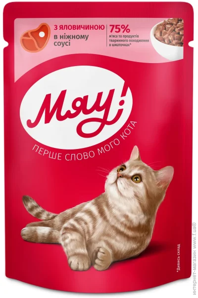 Отзывы Мяу! Корм влажный для взрослых кошек «С говядиной в нежном соусе» 85 г