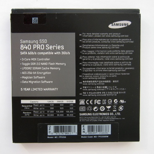 Твердотельный накопитель «Samsung SSD 840 Pro» выглядит одновременно солидно и красиво. Его корпус сделан из алюминия с черным анодированием, а боковины отшлифованы до блеска. На верхней крышке разместились крупный логотип и яркий терракотовый квадрат, основным предназначением которым является легкая и безошибочная идентификация производителя. С обратной стороны изделия поместили наклейку с подробностями о модели, серийном номере, наиболее актуальных технологиях и параметрах.