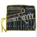 Набор комбинированных ключей производства Индия, каждый из которых представляет собой сочетание рожкового и накидного гаечного ключа. Размерная линейка набора – от 6 до 32 мм. Обе стороны изделий имеют одинаковый размер головки. Изготовлены из прочной хром-ванадиевой стали, физические и химические свойства которой обуславливают высокую стойкость к механическим нагрузкам, коррозионную стойкость и жесткость. Кроме того, легированная сталь обладает благоприятным модулем упругости. Удобная форма и изгиб рукоятки обеспечивают оптимальные условия для приложения усилия, благодаря чему можно закрутить/открутить крепеж. Ключи поставляются в удобном свертывающемся чехле с карманом под ключ каждого размера.
