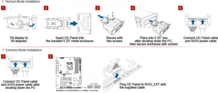 У комплект поставки Maximus VI Extreme входить модуль OC Panel, службовець для моніторингу і розгону системи. Його можна або встановити в стандартний 5,25-дюймовий відсік комп'ютера (стандартний Режим), або використовувати як зовнішній пристрій (екстремальний режим). OC Panel виводить на свій 2,6-дюймовий дисплей повну інформацію про стан системи. Дізнайтеся більше, клацнувши на відповідній закладці вище.