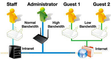 Роутер забезпечує можливість створення чотирьох бездротових мереж з динамічним розподілом смуги пропускання і контролем доступу. Наприклад, для керівника можна виділити максимально широку смугу і доступ до двох мереж (локальної мережі та мережі Інтернет), для співробітників - стандартну смугу і доступ тільки до локальної мережі, а для гостей - вузьку смугу і доступ тільки До мережі Інтернет. Це найкраще рішення для організації бездротової мережі рівня SOHO.