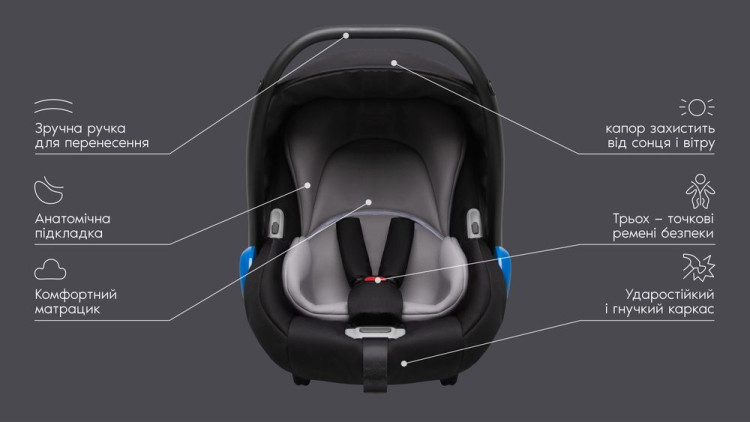 Чохол автолюльки має знімну оббивку, яку можна прати за температури 30°, а вбудований розсувний капор захистить від сонця і вітру. Є також можливість установки на шасі колясок за допомогою адаптерів.