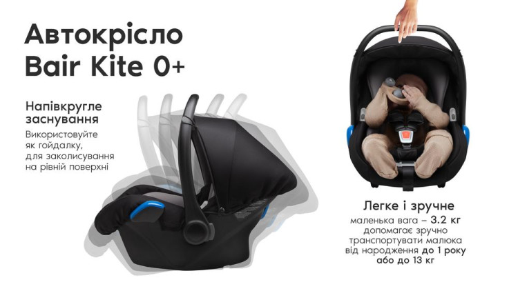 Автокрісло Bair Kite виготовлено відповідно до передового європейського стандарту безпеки та призначено для перевезення немовлят зростом до 75 см, що приблизно відповідає віку від народження до 12 місяців.