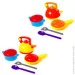 Набір яскравого пластикового посуду. У комплекті: чайник з кришечкою, каструля з кришкою, сковорідка з кришкою та 2 прилади для приготування.