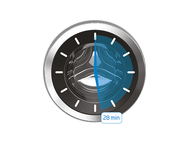 Якщо ви не хочете чекати цілу вічність, доки пральна машина закінчить свою роботу, спробуйте програму Daily Xpress. У режимі Daily Xpress ви зможете випрати повний комплект білизни лише за 28 хвилин за температури 30 °C. Прання закінчиться ще до того, як ви встигнете подивитися чергову півгодинну серію улюбленого серіалу.