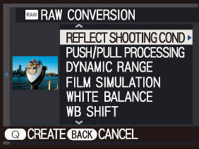 Вбудований RAW-конвертер дозволяє переглядати результати без необхідності передачі даних на ПК. Ця проста функція дозволяє не тільки враховувати корекцію експозиції, баланс білого і інші налаштування камери для управління якістю зображення, але і застосовувати Режими імітації плівки в режимі конвертера.
