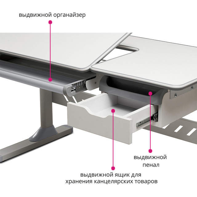 Головною відмінністю від старшої моделі є відсутність додаткової надбудови. Даний варіант столу відмінно підійде для тих, хто воліє більше вільного місця на робочому столі. Сучасний дизайн з різноманітними варіантами кольору, якісні матеріали, а також можливість індивідуально налаштувати висоту та нахил стільниці, це саме те, що робить цю парту ідеальним вибором для навчання дітей будь-якого віку.