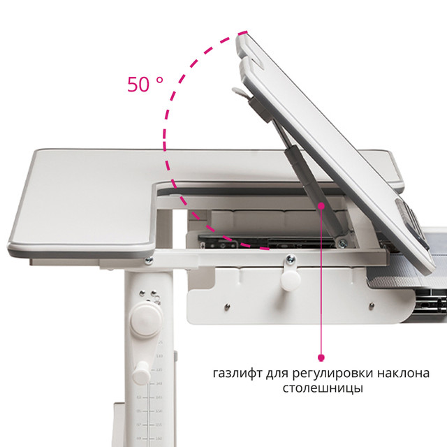 Завдяки можливості нахилу стільниці від 0 до 50 парта Fiore ідеально підходить для будь-якого виду навчання (лист, читання, малювання ...). Також варто відзначити важливість статичної частини стільниці, на якій можна розмістити лампу та ноутбук для віддаленого навчання. Нейтральний дизайн з різними варіантами кольору відмінно підходить як для хлопчиків так і для дівчаток.