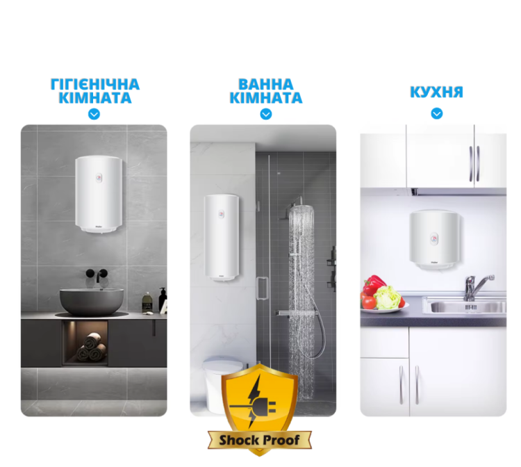 Електроводонагрівачі Haier – найнадійніші. З 2002 року кожна модель обладнана запатентованою технологією Shock Proof. Вона унеможливлює ураження електричним струмом навіть у випадку несправності, завдяки використанню діелектричних елементів, які виступають резистором між бойлером і тілом людини. Це знижує силу струму з 220 В до безпечних 12 В. У 2007 році технологію було включено до Міжнародного стандарту IEC.