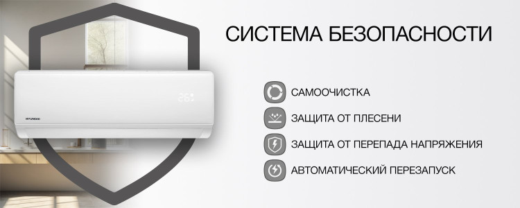 Безпека під час експлуатації електроприладів — один з пріоритетів компанії HYUNDAI, тому кондиціонери бренду оснащені низкою захисних функцій. Серед них — функція самоочищення, яка автоматично очищує систему після завершення роботи, запобігаючи накопиченню пилу та забруднень усередині приладу. Антибактеріальне покриття захищає внутрішні компоненти від утворення плісняви. Захист від перепадів напруги миттєво зупиняє роботу системи у разі коливань в електромережі, запобігаючи пошкодженням. А функція автоматичного перезапуску дає змогу пристрою відновити роботу з попередніми налаштуваннями після раптового вимкнення живлення.