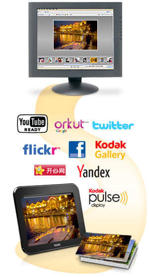 - Завантаження вручну на сайти KODAK Gallery, YouTube, FACEBOOK, FLICKR, TWITTER, ORKUT, YANDEX і KAIXIN001, ел. пошту і цифрову рамку KODAK PULSE.