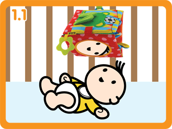 Метод: покладіть дитину животиком вниз, на підлогу. Складіть Щасливий трикутник в трикутник з дзеркалом, перед вашою дитиною. Нехай ваша дитина практикує руху шиєю і верхньої частини тіла, щоб спостерігати себе в дзеркалі. Ця діяльність допомагає дитині пізнавати себе, а також навчає м'язи верхньої частини тіла підготуватися до подальших тренувань.