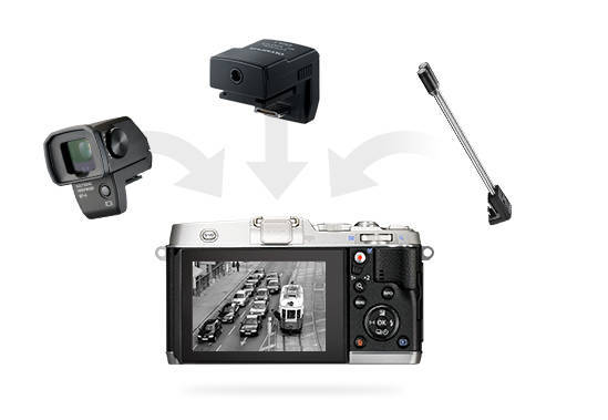 Розширюйте можливості своєї камери серії PEN і створіть свій «фірмовий» стиль фотознімків завдяки великому вибору аксесуарів Olympus: електронний видошукач (VF-4 і ін.), Зовнішній спалах (FL-14 та ін.), Комплект адаптера мікрофона (SEMA-1).