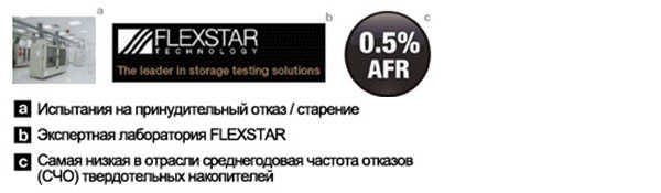 Твердотільні накопичувачі Plextor виробляються відповідно до Жорсткими стандартами якості і проходять всебічні випробування, тому вони відповідають вимогам компанії за бездоганній якості. Зокрема, 20-годинне випробування при високій температурі на примусовий відмову і строгі вимоги установки для Випробувань FLEXSTAR®, широко використовується в галузі, служать для моделювання реальної робочої середовища. Твердотільні накопичувачі Plextor відрізняються високою якістю, що підтверджується показником середньорічної частоти відмов (СЧО) - 0,5%, який є найнижчим в галузі.