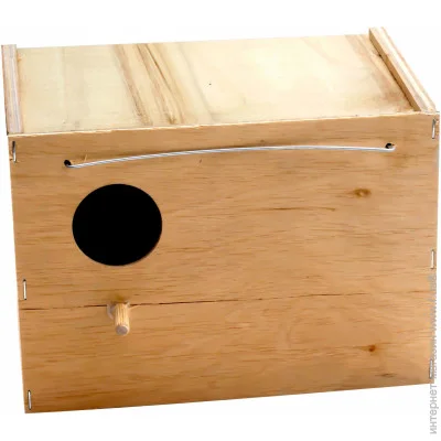 Будиночок для птахів. Виготовлений з фанери. Надійно кріпиться із зовнішнього боку клітки, добре тримається і виглядає естетично. Матеріал не містить токсичні речовини. Для комфорту пернатих вихованців встановлена спеціальна жердинка.