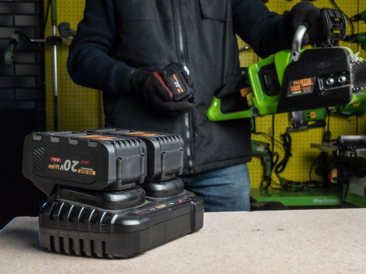 Для роботи таких електроінструментів як ланцюгові пилки або акумуляторні газонокосарки потрібні дві батареї. Для оптимізації робочого процесу найкраще використовувати їх разом із зарядним пристроєм для двох акумуляторів. Якщо ви використовуєте один набір батарей, ви можете просто помістити їх на зарядний пристрій після роботи, але якщо у вас є два або більше комплектів, ви можете продовжувати працювати, доки одна з пари заряджається.