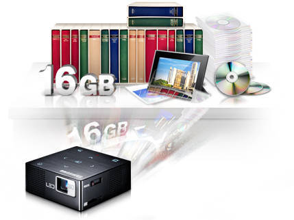Зберігайте фільми, музику або великі презентації, не боячись, що у вас не вистачить пам'яті. Проектор SP-H03 володіє 1Гб вбудованої пам'яті з можливістю її збільшення на 16 Гб, завдяки підтримці MicroSD-карт і USB-носіїв. А динамік потужністю 1 Вт, що відтворює якісний звук, робить використання SP-H03 ще більш вражаючим і зручним.
