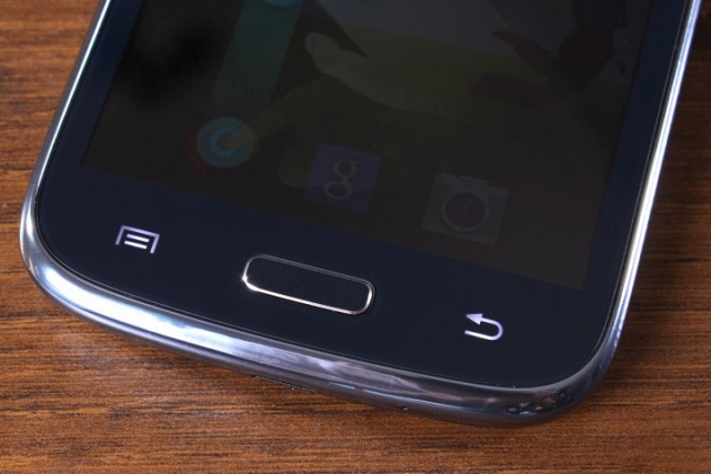 Большую часть фронтальной панели, как в большинстве современных смартфонов, занимает сенсорный дисплей, накрытый защитным стеклом. Над дисплеем находятся коммуникационный динамик, накрытый металлической сеткой, логотип Samsung, надпись DUOS, свидетельствующая о поддержке смартфоном работы с двумя сим-картами, фронтальная камера и датчик. Под дисплеем находятся широкая механическая клавиша «Home» и две сенсорные кнопки «Back» и «Menu». Ход кнопки «Home» чёткий, короткий и мягкий.