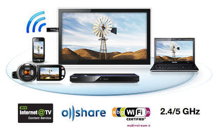 Oткройте для себе цілий світ розваг без зайвого клопоту. Бездротовий адаптер і сервіс Samsung Internet @ TV нададуть Вам доступ до багатих можливостей Інтернету прямо з телевізора. Адаптер забезпечує просте і зручне сполучення з мультимедійними пристроями, такими як сенсорний пульт ДУ, комп'ютери, камери, плеєри Blu-ray і мобільні телефони, а також підтримує інноваційну бездротову технологію Samsung All Share.
