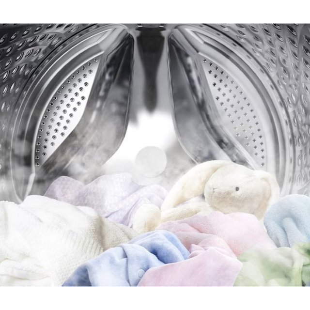 Забезпечує глибоке та гігієнічне очищення одягу. Технологія Hygiene Steam випускає пару з нижньої частини барабана. Він видаляє бруд, що в'ївся, і 99.9% бактерій*, а також знижує ефективність алергенів, що утворюються з кліщів домашнього пилу**. Цикл Hygiene Steam знижує вплив кліщів домашнього пилу, кішок, собак, пилку трав та грибків***.