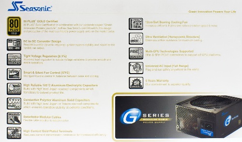 На звороті коробки дається опис тих особливостей фірмової продукції, що задіяні в моделі «Seasonic 750W SSR-750RM». Це наявність сертифіката відповідності стандарту «80 PLUS Gold», виділення окремих перетворювачів для ліній «+5 В» і «+3,3», Відхилення напруг вихідних ліній не більше трьох відсотків від номіналу, фірмова інтелектуальна система управління швидкістю обертання вентилятора під назвою «S2FC», застосування високоякісних електролітичних і полімерних японських конденсаторів, позолочені контакти роз'ємів для більш ефективної передачі високих струмів, тихий 120- Міліметровий вентилятор на довговічних шарикопідшипниках, вентиляційні решітки зі структурою у вигляді медових сот, підтримка конфігурацій з декількома відеоадаптерами, широкий діапазон вхідної напруги харчування, а також п'ятирічний гарантійний термін.