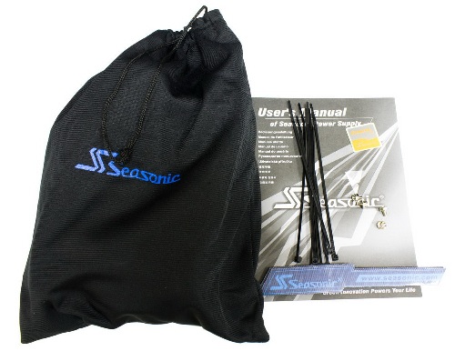 Комплектація аналогічна іншим Моделям даної серії. Та ж чорно-біла поліграфія «Керівництва користувача» і цілком стандартний вкладений комплект, ідентичний тому, що входить в комплектацію старших серій. Є що стали вже звичними одноразові чорні хомути, багаторазові стяжки на липучках синього кольору, набір фіксуючих винятково, мережевий шнур живлення і наклейка з фірмовим логотипом. Немає тільки красивого оксамитового чохла, передбаченого для старших серій виробничої лінійки компанії «Seasonic». Замість нього виробник вклав в Комплект чорний мішечок з синтетичної тканини для зберігання модульних кабелів.