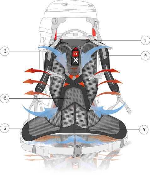 Система Х1 складається з двох ергономічно вигнутих (1) х-образно схрещених шин і поліетиленовою пластини (2), необхідної для Формування профілю спини. Алюмінієві шини приймають основне навантаження системи, перерозподіляють її на потужний стегнах ремінь (3), що складається з жорсткої конічної зігнутої 3D поліетиленовою пластини (4) і багатошарової подушки, що створює комфортне прилягання ременя до стегон. Посадка на стегнах поясу зручно регулюється при Допомогою гнучкої системи затягування ременя (5). Матеріал ремінця і анатомічної спинний подушки (6) максимально гладкий, щоб не натирати стегно і спину. У нижній частині ременя (7) вставка з Lumbar Pad для запобігання зісковзування рюкзака. За подушкою знаходиться коротка алюмінієва шина (8) анатомічної форми, що забезпечує оптимальну посадку рюкзака. Спинна прокладка (9) над поперекової подушкою має увігнуту Форму і прошиті секції (10) для поліпшення вентиляції, які гарантують щільне прилягання рюкзака до тіла. Прі правильному регулюванні поясний ремінь конусів в розпір лягає на верхню частину стегон і приймає 80-85% всього навантаження. Решта 15-20% навантаження припадають на плечові ремені анатомічної форми (11) з системою регулювання під різний зріст людини (12). Конструкція спини рюкзака і плечових ременів має систему каналів і вставок з Air Tex, що забезпечує чудову вентиляцію спини (13). Кришка рюкзака також Регулюється за висоті (14).
