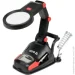 Третья ручка с кольцевой подсветкой из 10 светодиодов. Лупа двойная – большая диаметром 75 мм обеспечивает увеличение в 3 раза. Лупа меньшего размера – встроенная, диаметром 20 мм увеличивает изображение в 4,5 раза. Поворотный на 360° рычаг с трехточечной регулировкой угла позволяет свободно работать как внутри, так и вне зоны вспомогательного зажима. Два зажима типа «крокодил», установленные на подвижных рычагах, и двойные шаровые шарниры дают широкие возможности адаптации зажимов как к мелким украшениям, так и к небольшим печатным платам. В организации работы помогают подставка для паяльной губки, гнездо для колбы, валик для крепления паяльника и отсек для хранения, например, винтов от разборки.